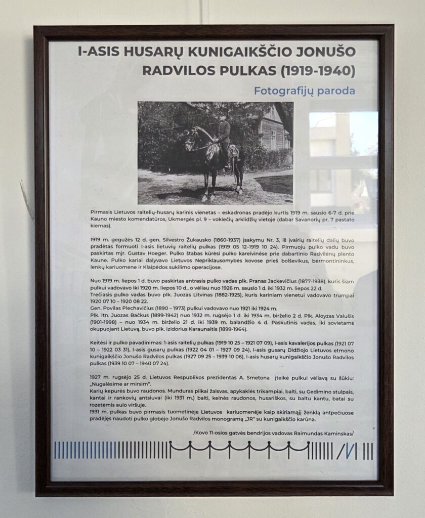 Istorinių nuotraukų parodą, remiantis įvairiais šaltiniais, pristatė LGGRTC Sekretoriato vyresnysis patarėjas, LŠS Vytauto Didžiojo II-osios rinktinės, ŠAK Kultūros ir meno būrio šaulys dr. Raimundas Kaminskas primindamas, kad pirmasis husarų (gusarų) Lietuvos Didžiojo Etmono kunigaikščio Jonušo Radvilos pulkas ar tam tikri jo vienetai veikė ir Vilniaus mieste 1920 m. bei 1939-1940 m.