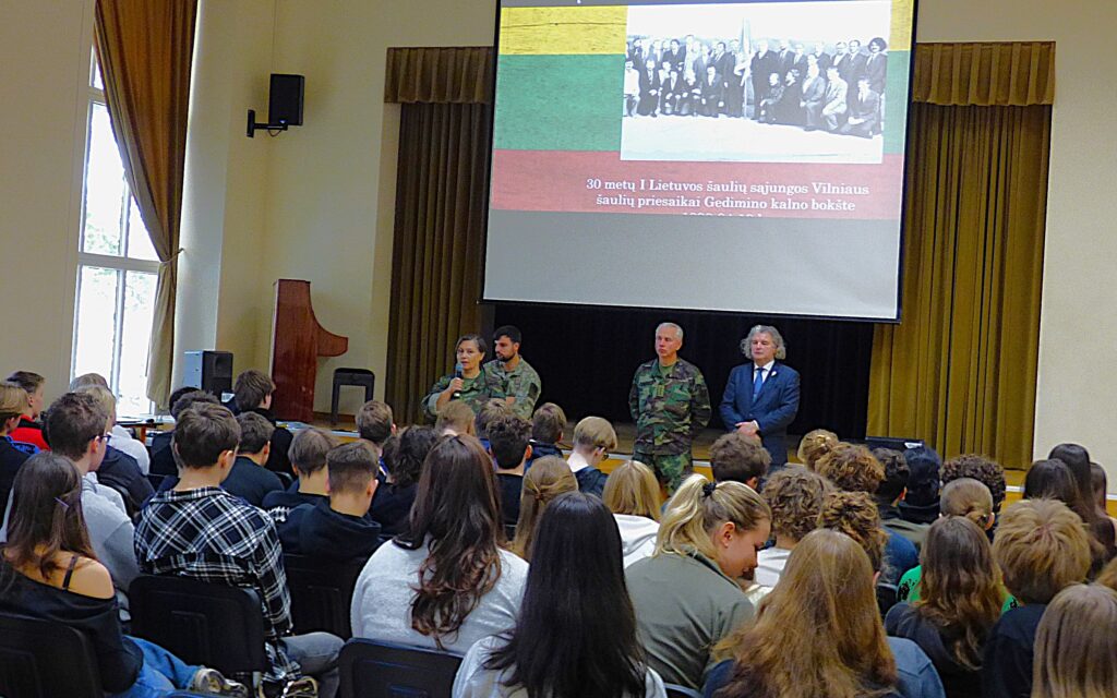 Pamokoje savo mintimis ir patirtimi dalijosi LŠS Karaliaus Mindaugo 10-osios rinktinės šaulė Asta Jolanta Miškinytė, kuri mokiniams pristatė savo šeimos istoriją ir išsaugotą Lietuvos trispalvę partizanų vėliavą. LK KASP Didžiosios Kovos apygardos 8-osios rinktinės karys Eimantas Čėsnys mokiniams papakojo apie savo patirtis Lietuvos kariuomenėje ir paragino besidominčius mokinius, prie jos vienais ir kitais būdais prisijungti.
